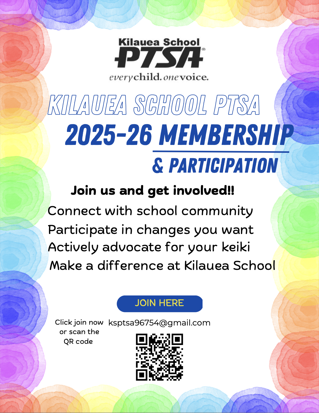 Actively advocate for your keiki, make a difference at Kilauea school! Join the PTSA for the 2025-2026 school year here.