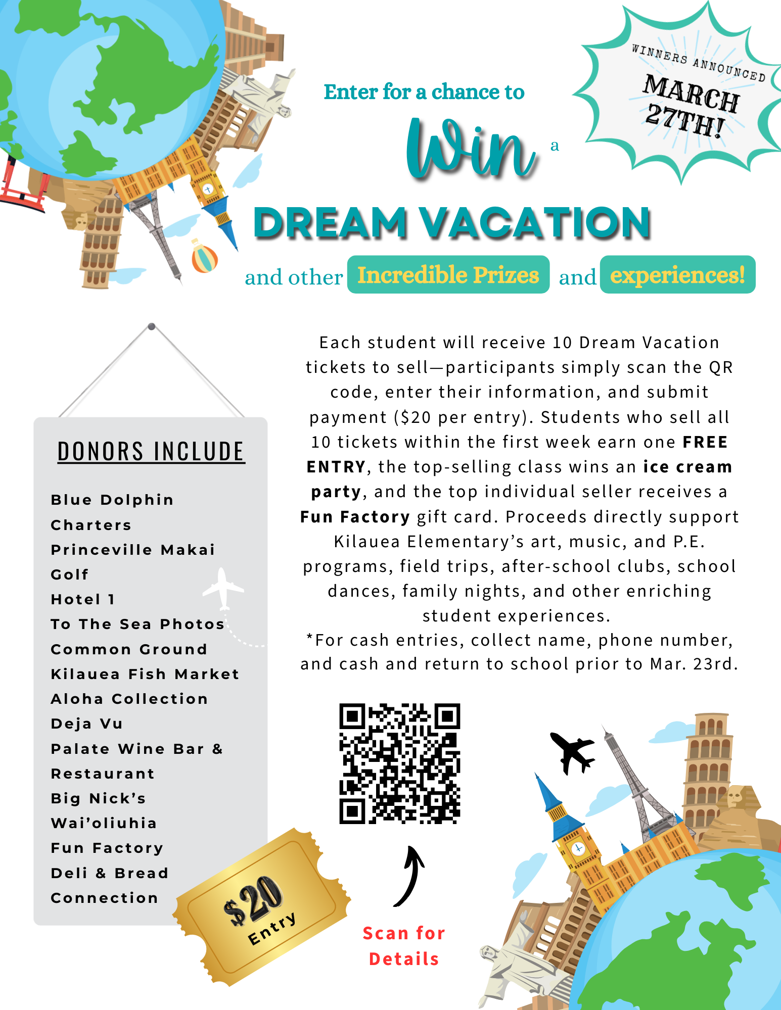Launching today, each student will receive 10 Dream Vacation tickets to sell-participants simply scan the QR code, enter their information, and submit payment ($20 per entry). Students who sell all 10 tickets within the first week earn one FREE ENTRY, the top-selling class wins an ice cream party, and the top individual seller receives a Fun Factory gift card. Proceeds directly support Kilauea Elementary's art, music, and P.E. programs, field trips, after-school clubs, school dances, family nights, and other enriching student experiences.